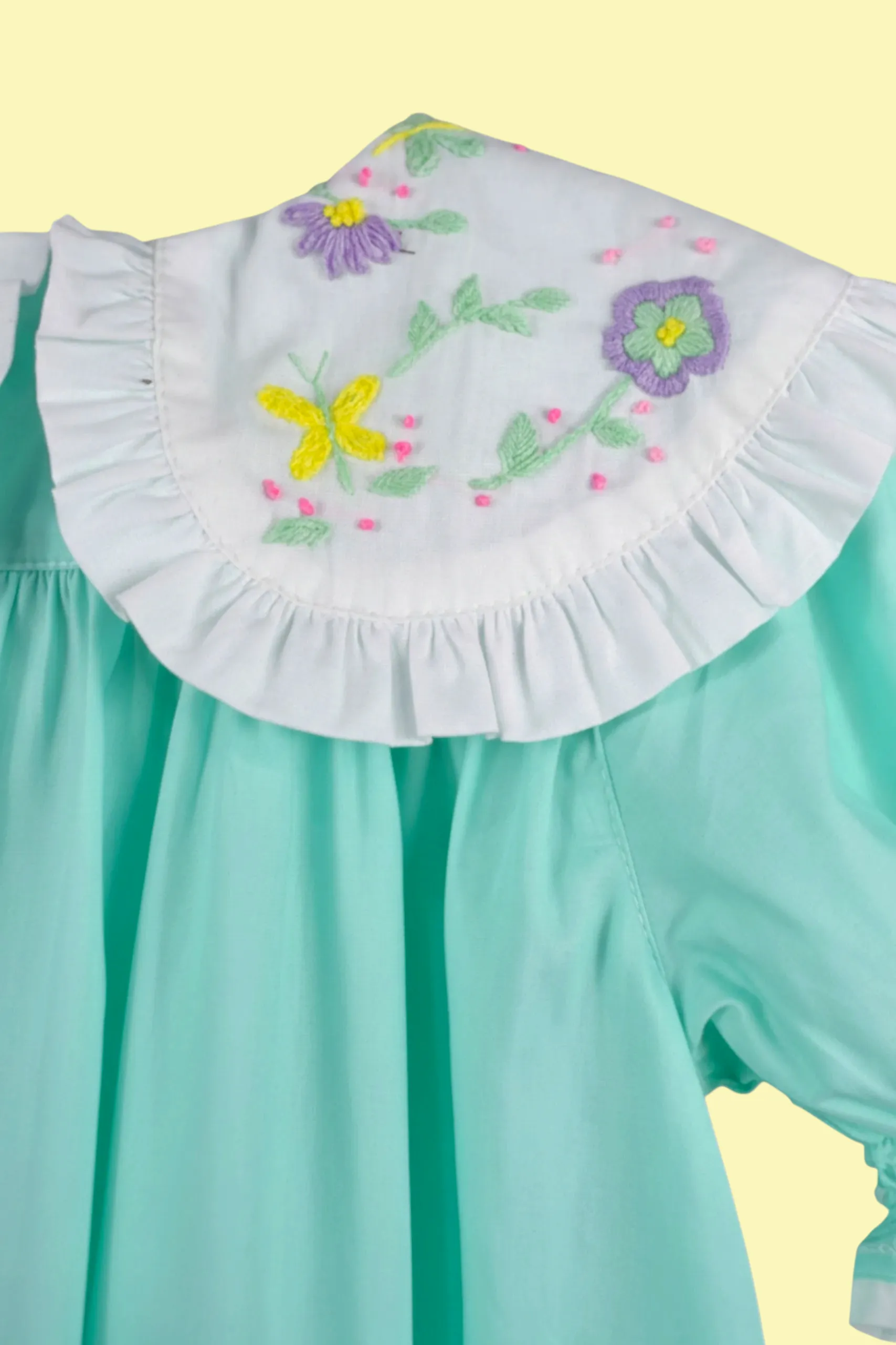 💚 Um modelo atemporal que valoriza a delicadeza da infância com o charme do bordado artesanal.