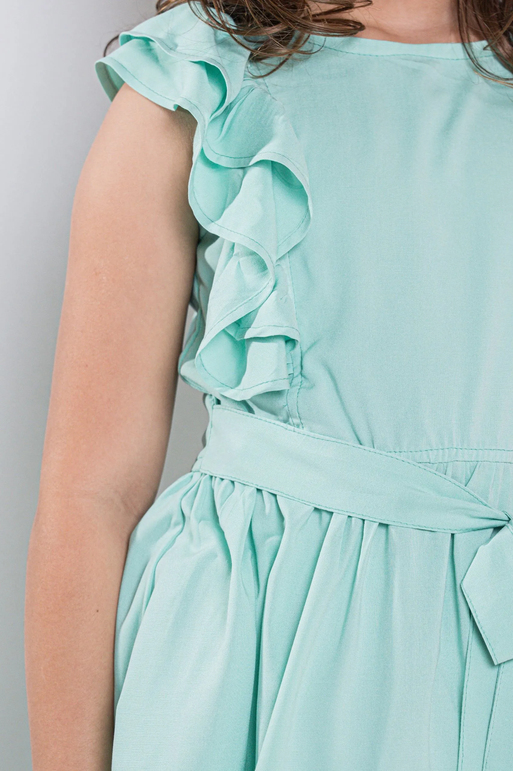 Deixe sua princesa ainda mais charmosa com este lindo vestido infantil em tom verde água. O design conta com babados delicados, cinto ajustável na cintura e uma saia rodada fluida, que garantem um visual elegante e divertido ao mesmo tempo.